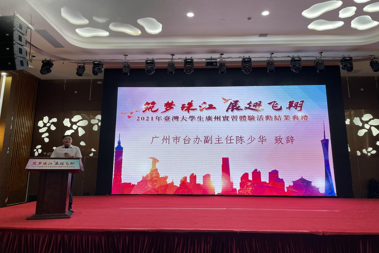 廣州市臺辦副主任陳少華在結業(yè)典禮上鼓勵臺灣大學生,把握“十四五”規(guī)劃以及粵港澳大灣區(qū)建設帶來的機遇,在中華民族偉大復興的征程中書寫精彩人生。