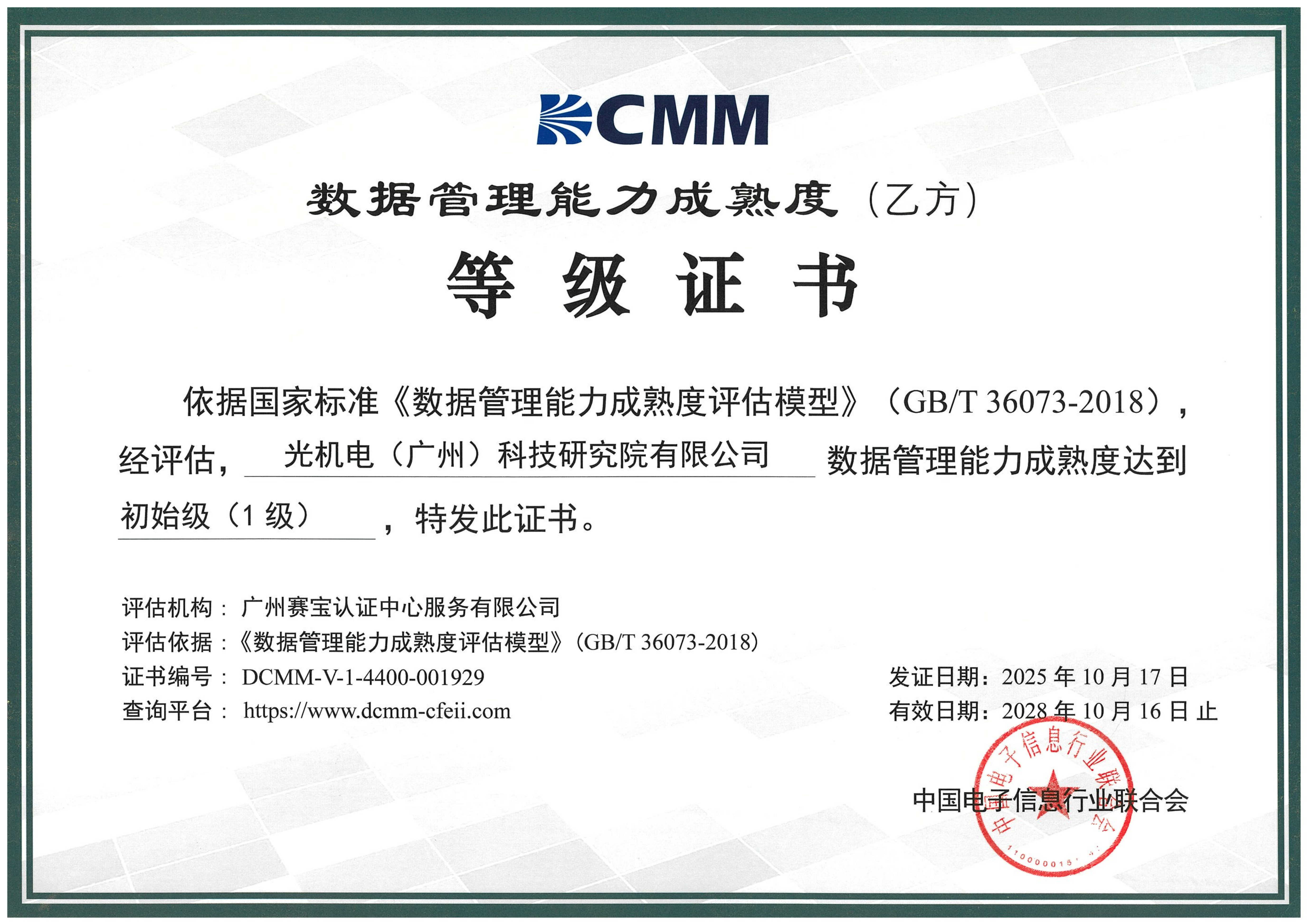 近日,光機(jī)電科技公司通過國家ITSS(信息技術(shù)服務(wù)標(biāo)準(zhǔn))、DCMM(數(shù)據(jù)管理能力成熟度評估模型)認(rèn)證機(jī)構(gòu)的專業(yè)評估,通過ITSS三級、DCMM一級認(rèn)證,標(biāo)志著公司在信息技術(shù)服務(wù)領(lǐng)域的規(guī)范化、專業(yè)化水平邁上新臺階。